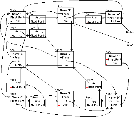 | The most basic connectivity representation has node, arc, and port objects (see Fig. 3.11). The node and arc objects in this figure are named and so have "name" attributes, which identify them. These objects also have "link" attributes, which collect them into two lists that form the circuit. An external list head for these lists is all that is needed to identify the entire collection. To link arcs with nodes, each arc object has a "from" and "to" attribute that points to node objects. Also, each node object has a "first port" attribute that heads a list of port objects. If there are no arcs connected to a node (as in node E of the figure), then this field is null because there are no ports. For every arc that does connect, there is a port object that contains a pointer to that arc. The port object also has a "next port" attribute that points to the next port object in the linked list on the node. When there are no more arc connections, and therefore no more ports, the "next port" attribute contains a null value to terminate the list. Figure 3.12 shows the circuit in a more natural way. |
