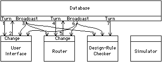 When the router gets a turn (action 4) it examines its queue of newly created or manipulated objects and checks to see whether it needs to make any connections. Routing action is not always incremental, but can be in Electric and is in this example. Any changes made (action 5) are again broadcast (action 6) and handled appropriately by each tool. For example, the user interface shows the new wires. The router knows not to examine its own changes when they are broadcast.