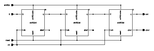 To make a large shift register, we simply connect several of these modules together. Below is a three-bit shift register and the waveforms from a simulation to confirm its behaviour.