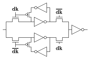 Double edge-triggered flipflops are becoming a popular technique for low-power designs since they effectively enable a halving of the clock frequency. The paper by Hossain et al[1] showed that while a single-edge triggered flipflop can be implemented by two transparent latches in series, a double edge-triggered flipflop can be implemented by two transparent latches in parallel; the circuit in Fig. 1 was given for the static flipflop implementation. The clock signal is assumed to be inverted locally. In high noise or low-voltage environments, Hossain et al noted that the p-type pass-transistors may be replaced by n-types or that all pass-transistors may be replaced by transmission gates.