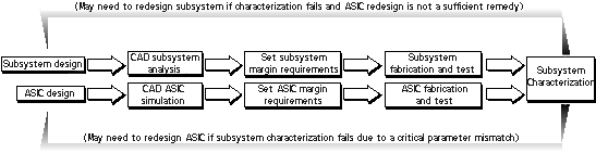 Ideally, ASIC development occurs in parallel with its subsystem, as shown in Figure 4.2.1, Parallel ASIC and Subsystem Development. ASIC margins are then set in context with overall subsystem margin requirements. After fabricating and testing engineering parts, designers perform a subsystem characterization. Here designers test a board-level prototype at worst-case margin limits for system performance. If the CAD system analysis was inaccurate or incomplete, the system may fail and require redesign at the ASIC or board level.