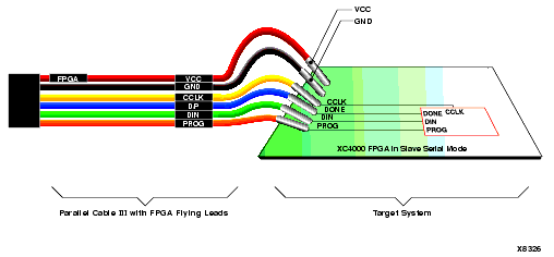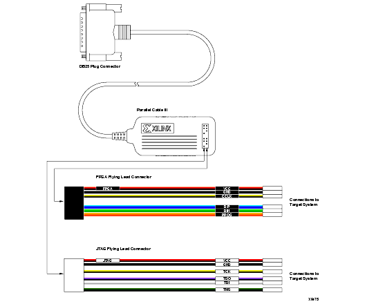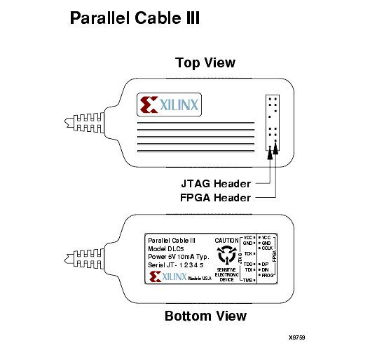 The Parallel Download Cable III consists of a cable assembly containing logic to protect your PC's parallel port and a set of headers to connect to your target system. PC III is replaced by PC IV in March 2002 with legacy support from iMPACT.