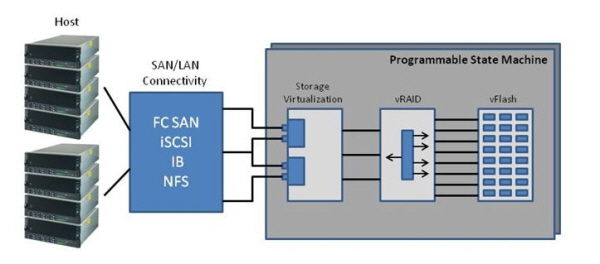 이러한 특성들은 GB당 비용이 낮은 NAND 플래시 메모리를 기반으로 한 새로운 유형의 스토리지 어레이를 이용해서 구현할 수 있다. 이 아키텍처는 2개 레벨의 플래시 기능, 플래시 제어(vFLASH), 플래시 RAID(vRAID)를 채택한다. 플래시 컨트롤러는 플래시 기술 읽기, 쓰기, 소거 동작과 플래시 변환 층에서 비트, 블록, 플레인, 칩 레벨의 오류 조건을 이용한다. vFLASH 기능은 로그 구조 데이터 레이아웃과 공간을 비워놓기 위한 플래시 관리 “garbage collection” 기능을 포함한다. 플래시 메모리에 이용하는 RAID 컨트롤러는 플래시의 고유의 특성들을 충족하기 위해서 전통적인 RAID-1 및 RAID-5 알고리즘 이상을 거쳐야 한다. 예를 들어서 4+1 패리티 모델은 전통적인 알고리즘보다 훨씬 더 효율적이고 지연시간이 낮으며, 또한 모듈 교체를 필요로 하지 않고 결함에 더욱 더 효과적으로 대처할 수 있다.