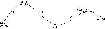 Cubic, or third-order, curves can be generated by giving a sequence of four or more points. Parabolic curve fitting is used on the ends and cubic fitting is used in the middle segments. For example, to draw the five-point curve in Fig. A.6, the following commands can be used (assuming absolute coordinates, m.n is 3.0 and current pen position is (3,5)):