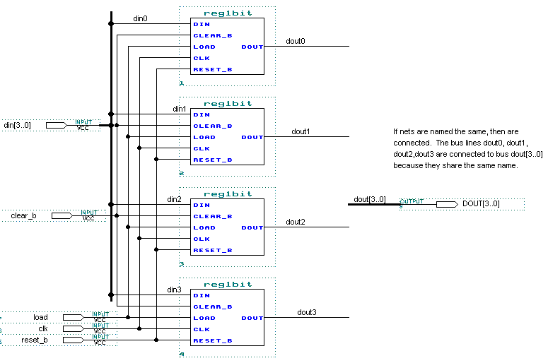 REG4BIT schematic - I have the DIN bus physically connected to all of its individual nets,