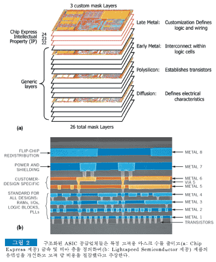 Ç¥ÁØ ¼¿ ASICÀÇ ·ÎÁ÷ ºí·ÏÀº FPGAÀÇ ·ÎÁ÷ ºí·Ïº¸´Ù ÈξÀ ¹Ì¼¼ÇÏ´Ù. "Ç¥ÁØ ¼¿"À̶ó´Â ¸íĪÀÌ ÀǹÌÇϵí ÀÌ ·ÎÁ÷ ºí·ÏÀº Æ®·£Áö½ºÅÍ ¹× ±âŸ ¿ÂĨ ±¸Á¶¸¦ À§ÇØ ÀÏÁ¤ÇÑ Å©±âÀÇ ¸éÀûÀ» »ç¿ëÇÑ´Ù. (ÀÌ·¯ÇÑ ±ÕÁú¼ºÀº ¿ÏÀü ÁÖ¹®Çü Ĩ°ú ±¸º°µÇ´Â Áß¿äÇÑ Æ¯Â¡ÀÌ´Ù). ±×·¯³ª, "ƯÁ¤ ¾ÖÇø®ÄÉÀ̼Ç"À̶ó´Â ¸»ÀÌ ÀǹÌÇÏµí ¼ÒÀÚÀÇ Å¬·°, Àü·Â, ½ÅÈ£ ¹è¼±¿¡ µû¸¥ ¹èÄ¡´Â »ç¿ëÀÚÀÇ ±¸Çö¿¡ µû¶ó ´Ù¸£´Ù. ±× °á°ú ¸ðµç ĨÀÇ ±Ý¼Ó ¹× ´ÙÁß ½Ç¸®ÄÜ ÃþÀÌ °í°´º°·Î µ¶Æ¯ÇÏ¸ç º¥´õ´Â ¼ÒÀÚ¸¦ ¼±ÀûÇϱâ Àü¿¡ ¹Ì¸® ¹è¼±À» ±¸¼ºÇϹǷΠ½Ã½ºÅÛ Á¦ÀÛ°ú ±×¿¡ ¼ö¹ÝµÇ´Â µ¿ÀÛÀ» ÁøÇàÇÏ´Â µ¿¾È Çϵå¿þ¾î ÁÖ¹®È ±â´ÉÀ» ´©¸± ¼ö ¾ø´Ù. ÀÌ °æ¿ì °³¹ß ¼ÒÇÁÆ®¿þ¾î´Â °ÅÄ£ FPGAÀÇ °æ¿ìó·³ °¢ ·ÎÁ÷ ºí·Ï ³»¿¡¼ ¼³°è¸¦ È¿À²ÀûÀ¸·Î ±¸ÇöÇÏ´Â µ¥ ÃÊÁ¡À» ¸ÂÃß´Â °ÍÀÌ ¾Æ´Ï¶ó ºí·ÏÀ» È¿À²ÀûÀ¸·Î »óÈ£ ¿¬°áÇÏ´Â µ¥ ÁßÁ¡À» µÎ°Ô µÈ´Ù.