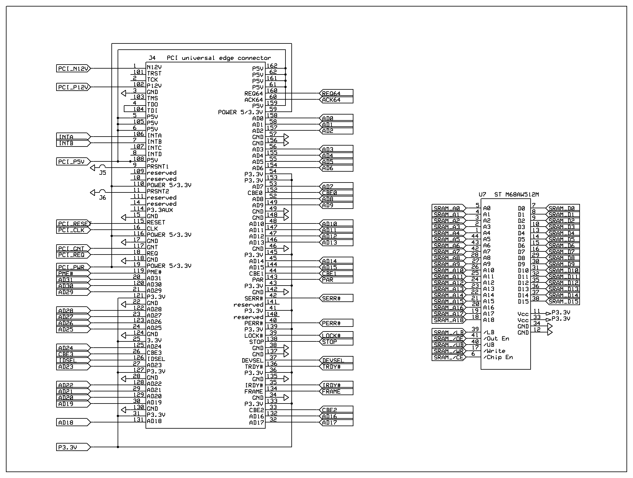 When I created the PCB, I wasn't sure which PCI signals were necessary, and I included too many. The DAC also uses too many lines. I designed the board with a 16-bit part in mind, but that was not available so I used the 12-bit version instead. With the noise from a common digital and analog ground plane, it is unlikely that the difference in resolution matters. The SRAM chip on one of my boards had bad address lines on data bits 5 and 6, so I swapped the lines with bits 0 and 1 in the .UCF pinout file. For real fun and games, replace the SRAM with DRAM.