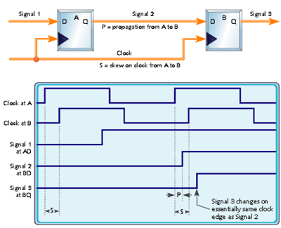 Figure 2 shows what will happen if the skew is greater than the propagation time (S > P). The intent of the circuit is to delay Signal 1 by two rising edges of the clock. However, a change in Signal 1 could propagate th rough to Signal 3 on the same clock cycle that caused the change at Signal 2. Because S > P, the circuit behaves incorrectly.
