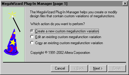 In the first page of the MegaWizard Plug-In Manager, make sure Create a new custom megafunction variation is selected and click Next.