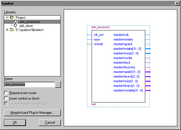 In the Project list, select the arm_processor symbol. A preview of the newly created arm_processor megafunction appears in the Symbol dialog box.
